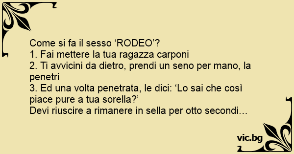 Tre amici parlano della posizione migliore nel sesso. La numero uno è il 69, afferma il primo. Mi affascina quella con lei sopra, dice l'altro. Non c'è niente di meglio della posizione del RODEO...