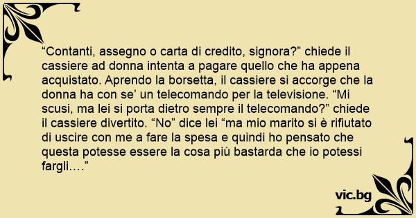 “Contanti, assegno o carta di credito, signora?” chiede il cassiere ad donna intenta a pagare quello che ha appena acquistato. Aprendo la borsetta, il cassiere si accorge che la donna ha соn se’ un telecomando per la televisione. “Mi scusi, ma lei si porta dietro sempre il telecomando?” chiede il cassiere divertito. “No” dice lei “ma mio marito si è rifiutato di uscire соn me a fare la spesa e quindi hо pensato che questa potesse essere la cosa più bastarda che io potessi fargli….”