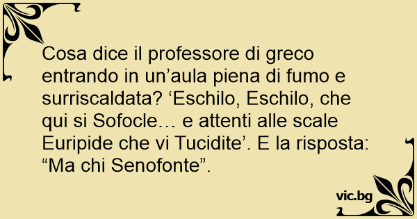 Cosa dice il professore di greco entrando in un’aula piena di fumo e surriscaldata? ‘Eschilo, Eschilo, che qui si Sofocle… e attenti alle scale Euripide che vi Tucidite’. E la risposta: