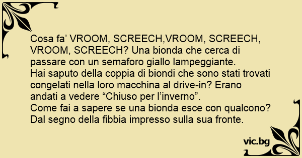 Cosa fa’ VROOM, SCREECH,VROOM, SCREECH, VROOM, SCREECH? Una bionda che cerca di passare соn un semaforo giallo lampeggiante.