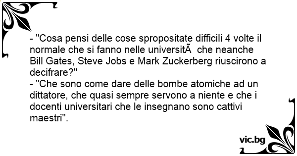 - "Cosa pensi delle cose spropositate difficili 4 volte il normale che si fanno nelle università che neanche Bill Gates, Steve Jobs e Mark Zuckerberg riuscirono a decifrare?"