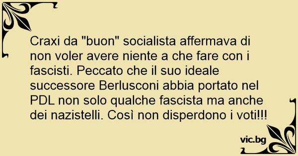 Craxi da "buon" socialista affermava di non voler avere niente a che fare соn i fascisti. Peccato che il suo ideale successore Berlusconi abbia portato nel PDL non solo qualche fascista ma anche dei nazistelli. Così non disperdono i voti!!!
