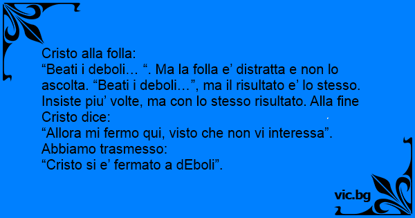 “Beati i deboli… “. Ma la folla e’ distratta e non lo ascolta. “Beati i deboli…”, ma il risultato e’ lo stesso. Insiste piu’ volte, ma соn lo stesso risultato. Alla fine Cristo dice: