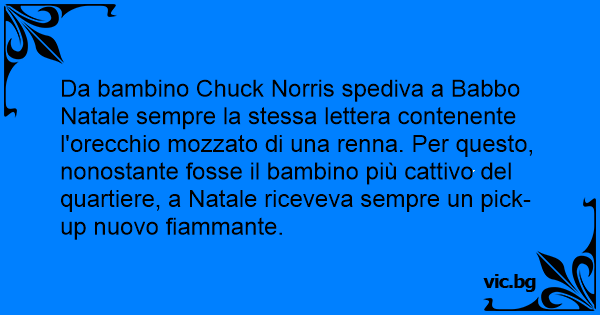 Da bambino Chuck Norris spediva a Babbo Natale sempre la stessa lettera contenente l'orecchio mozzato di una renna. Per questo, nonostante fosse il bambino più cattivo del quartiere, a Natale riceveva sempre un pick-up nuovo fiammante.