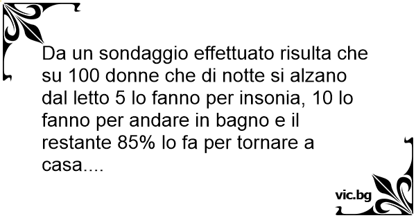 Da un sondaggio effettuato risulta che su 100 donne che di notte si alzano dal letto 5 lo fanno per insonia, 10 lo fanno per andare in bagno e il restante 85% lo fa per tornare a casa....