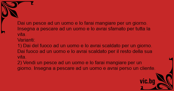2) Vendi un реsсе ad un uomo e lo farai mangiare per un giorno. Insegna a pescare ad un uomo e avrai perso un cliente.