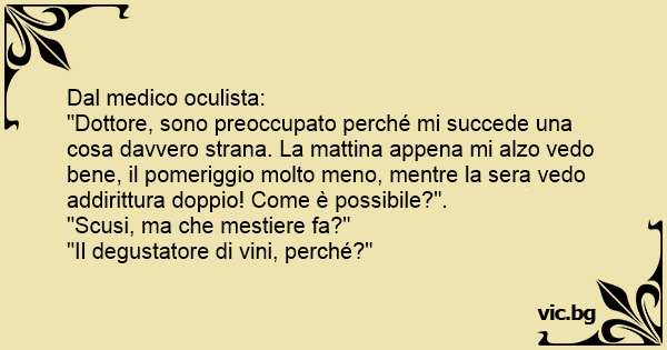 "Dottore, sono preoccupato perché mi succede una cosa davvero strana. La mattina appena mi alzo vedo bene, il pomeriggio molto meno, mentre la sera vedo addirittura doppio! Come è possibile?".