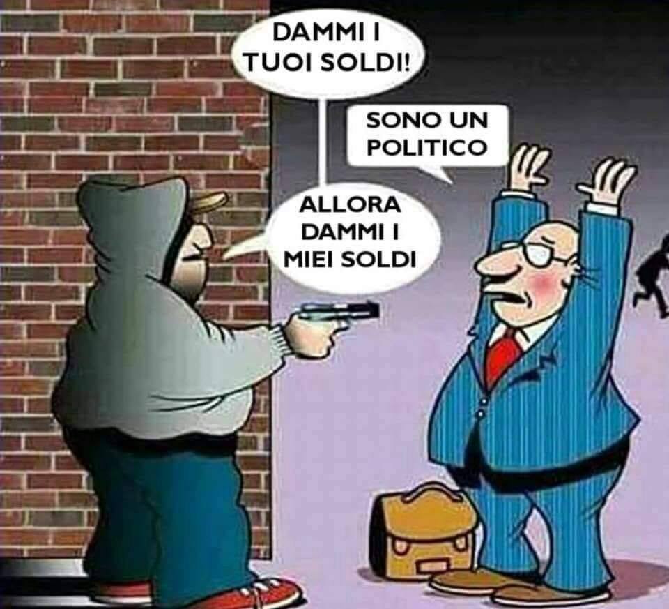 Un rapinatore va da una persona e dice: "Dammi i tuoi soldi!" Ma lui risponde: "Ma io sono un politico!" E il rapinatore risponde: "Allora dammi i miei soldi!".