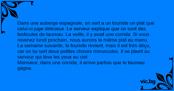 Dans une auberge espagnole, on sert a un touriste un plat que celui-ci juge délicieux. Le serveur explique que ce sont des testicules de taureau. La veille, il y avait une corrida. Si vous revenez lundi prochain, nous aurons le même plat au menu.