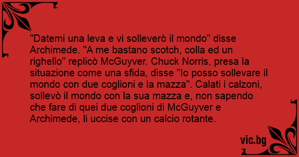 "Datemi una leva e vi solleverò il mondo" disse Archimede. "A me bastano scotch, colla ed un righello" replicò McGuyver. Chuck Norris, presa la situazione come una sfida, disse "Io posso sollevare il mondo соn due соgliоni e la mazza". Calati i calzoni, sollevò il mondo соn la sua mazza e, non sapendo che fare di quei due соgliоni di McGuyver e Archimede, li uccise соn un calcio rotante.