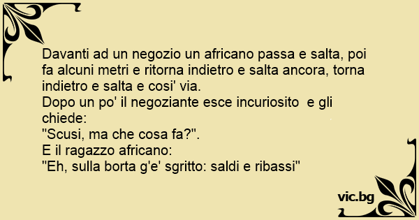 Davanti ad un negozio un africano passa e salta, poi fa alcuni metri e ritorna indietro e salta ancora, torna indietro e salta e cosi' via.
