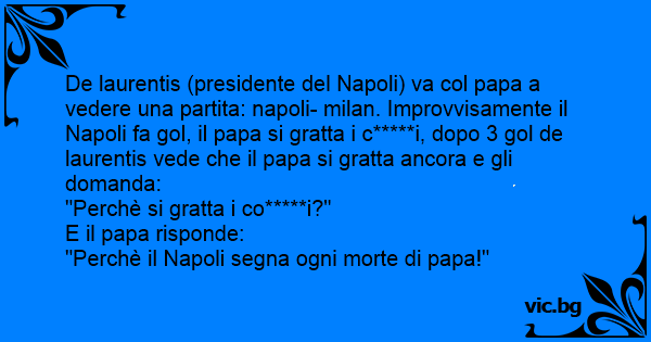 De laurentis (presidente del Napoli) va col papa a vedere una partita: napoli- milan. Improvvisamente il Napoli fa gol, il papa si gratta i c*****i, dopo 3 gol de laurentis vede che il papa si gratta ancora e gli domanda: