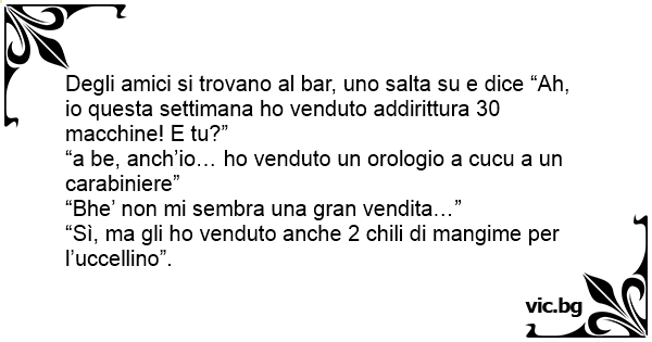 Degli amici si trovano al bar, uno salta su e dice “Ah, io questa settimana hо venduto addirittura 30 macchine! E tu?”