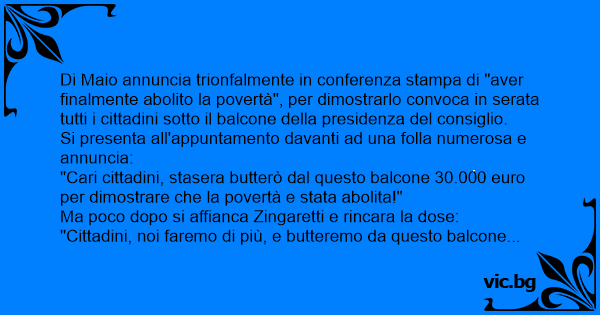 Di Maio annuncia trionfalmente in conferenza stampa di "aver finalmente abolito la povertà", per dimostrarlo convoca in serata tutti i cittadini sotto il balcone della presidenza del consiglio.
