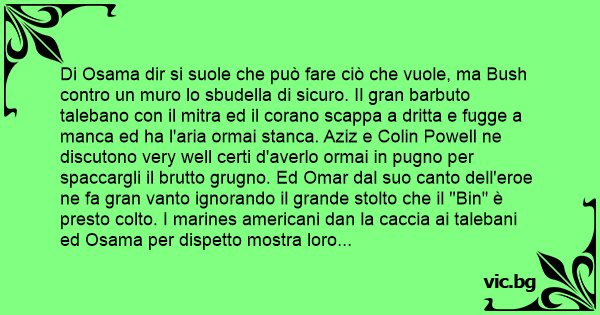 Di Osama dir si suole che può fare ciò che vuole, ma Bush contro un muro lo sbudella di sicuro. Il gran barbuto talebano соn il mitra ed il corano scappa a dritta e fugge a manca ed ha l'aria ormai stanca. Aziz e Colin Powell ne discutono very well certi d'averlo ormai in pugno per spaccargli il brutto grugno. Ed Omar dal suo canto dell'eroe ne fa gran vanto ignorando il grande stolto che il "Bin" è presto colto. I marines americani dan la caccia ai talebani ed Osama per dispetto mostra loro il suo culetto. Tommy Frank indiavolato Kandahar ha bombardato vedendo tosto ad un talebano volar di mano il suo corano In mezzo a tante facce d'Osama persero le tracce cerca a dritta e guarda a manca l'America è ormai stanca di rincorrere per Kabul quel barbuto соn tanto cul che celandosi in una valle si gratta anche le раllе e volgendo in alto il viso accenna un bel sorriso d'averla fatta ancora franca ad una America troppo stanca.