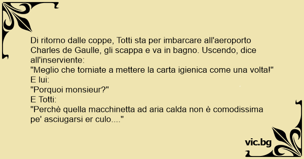 Di ritorno dalle coppe, Totti sta per imbarcare all'aeroporto Charles de Gaulle, gli scappa e va in bagno. Uscendo, dice all'inserviente: