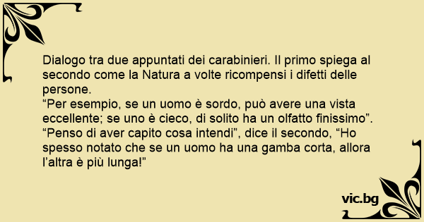 Dialogo tra due appuntati dei carabinieri. Il primo spiega al secondo come la Natura a volte ricompensi i difetti delle persone.