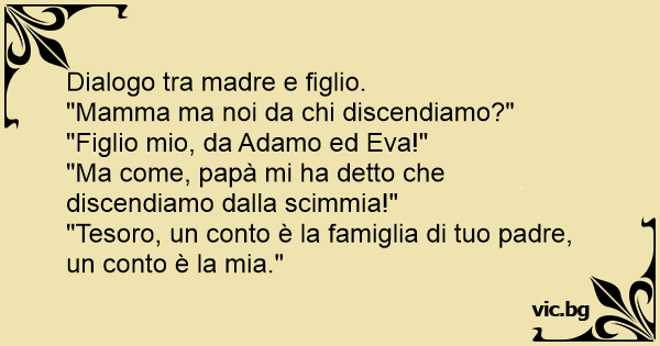 Дете ја прашува мајката: - Мамо како настанале луѓето? - Од мајмуни сине! После тоа детето оди кај татко си: - Тато како настанале луѓето? - Господ ги створил сине! - Ама мама вика дека се...