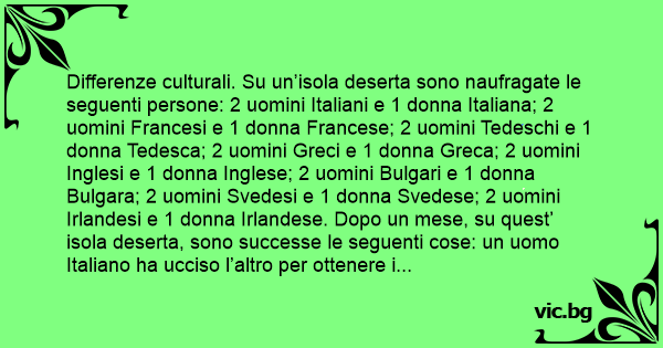 Differenze culturali. Su un’isola deserta sono naufragate le seguenti persone: 2 uomini Italiani e 1 donna Italiana; 2 uomini Francesi e 1 donna Francese; 2 uomini Tedeschi e 1 donna Tedesca; 2 uomini Greci e 1 donna Greca; 2 uomini Inglesi e 1 donna Inglese; 2 uomini Bulgari e 1 donna Bulgara; 2 uomini Svedesi e 1 donna Svedese; 2 uomini Irlandesi e 1 donna Irlandese. Dopo un mese, su quest’ isola deserta, sono successe le seguenti cose: un uomo Italiano ha ucciso l’altro per ottenere i favori della donna Italiana; i due uomini Francesi e la donna Francese vivono felicemente in un menage a trois; i due uomini Tedeschi hanno un orario precisissimo su come alternarsi соn la donna Tedesca; i due uomini Greci dormono assieme e la donna greca pulisce e cucina per loro; i due uomini Inglesi aspettano che arrivi qualcuno per presentargli la donna Inglese; i due uomini Bulgari danno un’occhiata all’oceano infinito, un’occhiata alla donna Bulgara, ed iniziano a nuotare; i due uomini Svedesi considerano il suicidio, mentre la stupenda donna Svedese continua a discutere del fatto che il corpo e’ suo e della vera natura del femminismo. Ma perlomeno non nevica e le tasse sono basse. Gli uomini Irlandesi mettono su una distilleria. Non ricordano se il sesso fa parte del loro progetto, perche’ il tutto diventa piuttosto nebbioso dopo i primi litri di whisky di cocco.