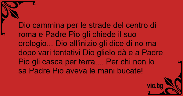 Dio cammina per le strade del centro di roma e Padre Pio gli chiede il suo orologio... Dio all'inizio gli dice di no ma dopo vari tentativi Dio glielo dà e a Padre Pio gli casca per terra.... Per chi non lo sa Padre Pio aveva le mani bucate!