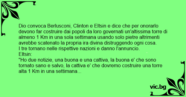 Dio convoca Berlusconi, Clinton e Eltsin e dice che per onorarlo devono far costruire dai popoli da loro governati un'altissima torre di almeno 1 Km in una sola settimana usando solo pietre altrimenti avrebbe scatenato la propria ira divina distruggendo ogni cosa.