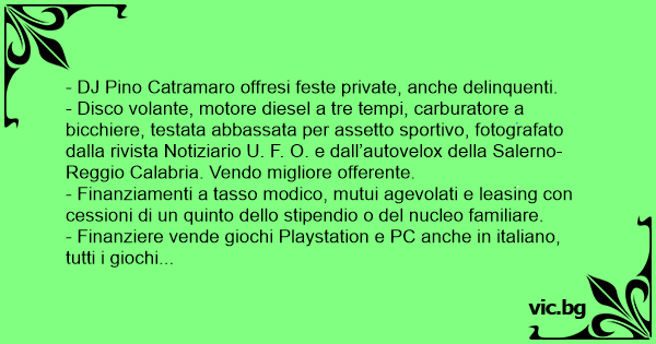 - Disco volante, motore diesel a tre tempi, carburatore a bicchiere, testata abbassata per assetto sportivo, fotografato dalla rivista Notiziario U. F. O. e dall’autovelox della Salerno-Reggio Calabria. Vendo migliore offerente.