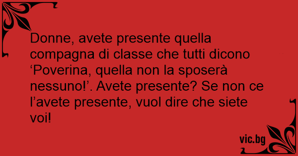 Donne, avete presente quella compagna di classe che tutti dicono ‘Poverina, quella non la sposerà nessuno!’. Avete presente? Se non ce l’avete presente, vuol dire che siete voi!