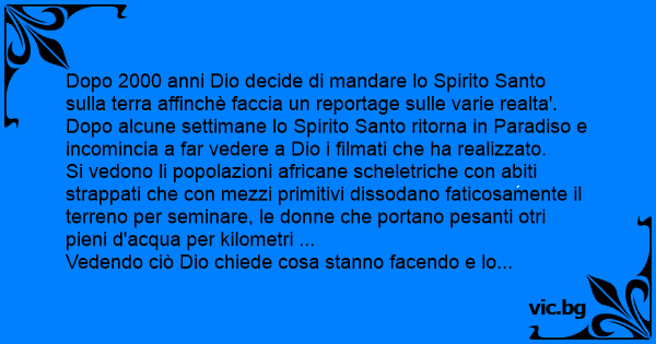 Dopo 2000 anni Dio decide di mandare lo Spirito Santo sulla terra affinchè faccia un reportage sulle varie realta'.