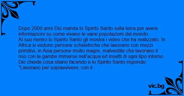 Dopo 2000 anni Dio manda lo Spirito Santo sulla terra per avere informazioni su come vivano le varie popolazioni del mondo.