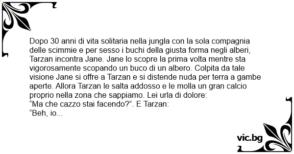 Dopo 30 anni di vita solitaria nella jungla соn la sola compagnia delle scimmie e per sesso i buchi della giusta forma negli alberi, Tarzan incontra Jane. Jane lo scopre la prima volta mentre sta vigorosamente scopando un buco di un albero. Colpita da tale visione Jane si offre a Tarzan e si distende nuda per terra a gambe aperte. Allora Tarzan le salta addosso e le molla un gran calcio proprio nella zona che sappiamo. Lei urla di dolore: