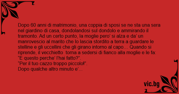 Dopo 60 anni di matrimonio, una coppia di sposi se ne sta una sera nel giardino di casa, dondolandosi sul dondolo e ammirando il tramonto. Ad un certo punto, la moglie pero’ si alza e da’ un manrovescio al marito che lo lascia stordito a terra a guardare le stelline e gli uccellini che gli girano intorno al capo… Quando si riprende, il vecchietto torna a sedersi di fianco alla moglie e le fa: