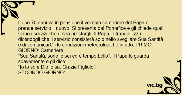 Dopo 70 anni va in pensione il vecchio cameriere del Papa e prende servizio il nuovo. Si presenta dal Pontefice e gli chiede quali siano i servizi che dovrà prestargli. Il Papa lo tranquillizza, dicendogli che il servizio consisterà solo nello svegliare Sua Santità e di comunicarGli le condizioni meteorologiche in atto. PRIMO GIORNO: Cameriere:
