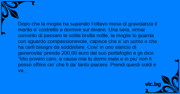 Dopo che la moglie ha superato l’ottavo mese di gravidanza il marito e’ costretto a dormire sul divano. Una sera, ormai convinto di passare la solita brutta notte, la moglie lo guarda соn sguardo compassionevole, capisce che e’ un uomo e che ha certi bisogni da soddisfare. Cosi’ in uno slancio di generosita’ prende 200,00 euro dal suo portafoglio e gli dice:
