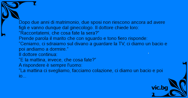 Dopo due anni di matrimonio, due sposi non riescono ancora ad avere figli e vanno dunque dal ginecologo. Il dottore chiede loro: