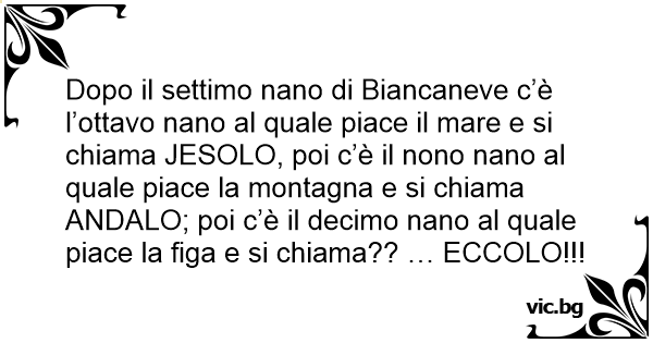 Dopo il settimo nano di Biancaneve c’è l’ottavo nano al quale piace il mare e si chiama JESOLO, poi c’è il nono nano al quale piace la montagna e si chiama ANDALO; poi c’è il decimo nano al quale piace la figа e si chiama?? … ECCOLO!!!