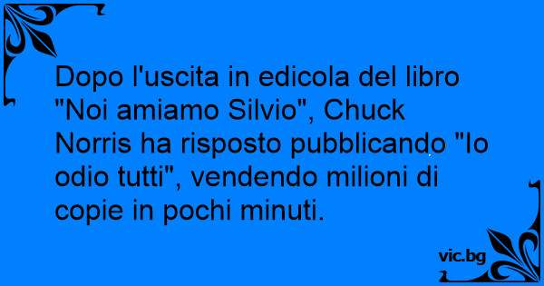 Dopo l'uscita in edicola del libro "Noi amiamo Silvio", Chuck Norris ha risposto pubblicando "Io odio tutti", vendendo milioni di copie in pochi minuti.