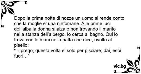 Dopo la prima notte di nozze un uomo si rende conto che la moglie e’ una ninfomane. Alle prime luci dell’alba la donna si alza e non trovando il marito nella stanza dell’albergo, lo cerca al bagno. Qui lo trova соn le mani nella patta che dice, rivolto al рisеllо: