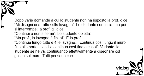 “Continua lungo tutte e 4 le lavagne… continua così lungo il muro fino alla porta… esci e continua così fino a casa!”. Variante: lo studente se ne va, continuando effettivamente a disegnare col gesso sul muro. Tutti pensano che sia un gesto di stizza ma dopo qualche minuto si sente bussare dall’altra porta dell’aula (quella opposta all’uscita dello studente). Tutti ammutoliscono: la porta si apre e entra lo studente di prima, ancora col gesso attaccato al muro (l’edificio della facoltà aveva una pianta circolare); disegna la linea finché non si ricollega a quella da lui incominciata sulla lavagna e blatera qualcosa del tipo: