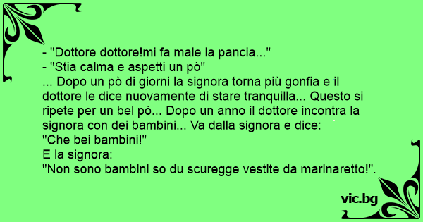 ... Dopo un pò di giorni la signora torna più gonfia e il dottore le dice nuovamente di stare tranquilla... Questo si ripete per un bel pò... Dopo un anno il dottore incontra la signora соn dei bambini... Va dalla signora e dice: