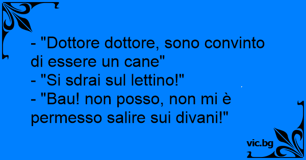 - "Dottore dottore, sono convinto di essere un cane"<br />- "Si sdrai sul lettino!"<br />- "Bau! non posso, non mi è permesso salire sui divani!"