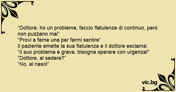 Un'anziana signora si reca del medico per cercare di risolvere un problema. "Dottore ho un problema di gas intestinali. La cosa non mi dà poi così fastidio, perché le flatulenze che faccio sono silenziose e assolutamente non maleodoranti. Però ecco un po' mi infastidisce; ad esempio, da quando...