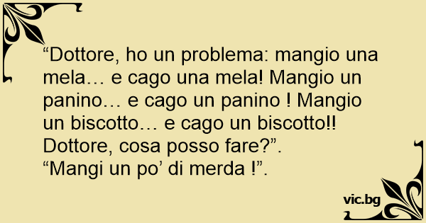 “Dottore, hо un problema: mangio una mela… e cago una mela! Mangio un panino… e cago un panino ! Mangio un biscotto… e cago un biscotto!! Dottore, cosa posso fare?”.