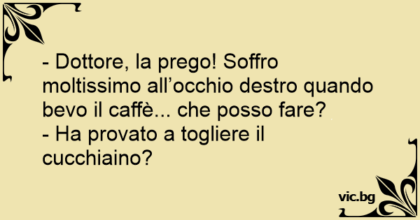 Carabiniere dal dottore: “Dottore, tutte le volte che bevo del caffe’ ho un forte dolore all’occhio”. “Ha provato a togliere il cucchiaino?”.