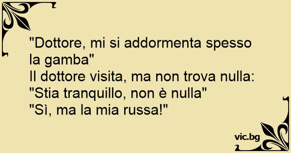 "Dottore, mi si addormenta spesso la gamba"<br />Il dottore visita, ma non trova nulla:<br />"Stia tranquillo, non è nulla"<br />"Sì, ma la mia russa!"