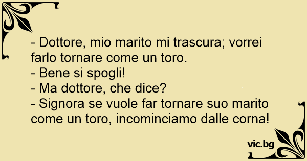 - Sa dottore, non è per me, ma per mio marito, sembra che perda colpi, non riesce più a concludere niente. Mi aiuti… non so più cosa fare! - Si spogli signora. - Ma… è per mio marito, non per me! - Non si preoccupi signora… farò diventare suo marito un TORO!!! - Mi fa molto piacere dottore… ma…...