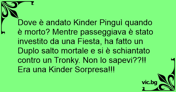Dove è andato Kinder Pinguì quando è morto? Mentre passeggiava è stato investito da una Fiesta, ha fatto un Duplo salto mortale e si è schiantato contro un Tronky. Non lo sapevi??!! Era una Kinder Sorpresa!!!