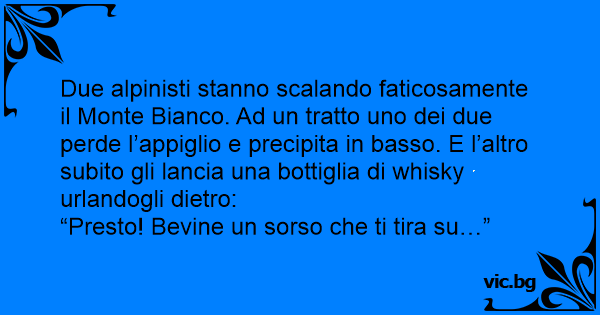 Due alpinisti stanno scalando faticosamente il Monte Bianco. Ad un tratto uno dei due perde l’appiglio e precipita in basso. E l’altro subito gli lancia una bottiglia di whisky urlandogli dietro:<br />“Presto! Bevine un sorso che ti tira su…”