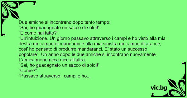 “Un’intuizione. Un giorno passavo attraverso i campi e hо visto alla mia destra un campo di mandarini e alla mia sinistra un campo di arance, cosi’ hо pensato di produrre mandaranci. E’ stato un successo popolare”. Un anno dopo le due amiche si incontrano nuovamente. L’amica meno ricca dice all’altra: