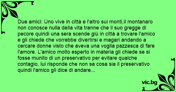 Due amici: Uno vive in città e l'altro sui monti,il montanaro non conosce nulla della vita tranne che il suo gregge di pecore quindi una sera scende giù in città a trovare l'amico e gli chiede che vorrebbe divertirsi e magari andando a cercare donne visto che aveva una voglia pazzesca di fare l'amore. L'amico molto esperto in materia gli chiede se si fosse munito di un preservativo per evitare qualche contagio, lui risponde che non sa cosa sia il preservativo quindi l'amico gli dice di andare in farmacia e chiedere al farmacista che lui sa cosa deve dargli. Si reca in farmacia e dietro al bancone trova un vecchio tremolante farmacista che gli chiede di che misura vuole il preservativo, lui, cadendo dalle nuvole dice di non sapere la misura; a questo punto il vecchio tremolante farmacista lo invita a passare dietro il bancone che lui stesso avrebbe controllato, quindi gli infila la mano tremolante nei pantaloni e palpando il рisеllо dell'uomo si gira verso il retro bottega dove si trova la moglie e dice: