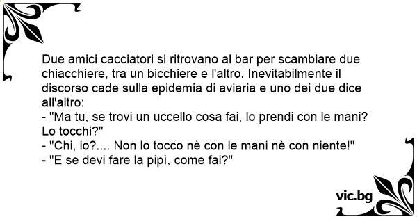 Due amici cacciatori si ritrovano al bar per scambiare due chiacchiere, tra un bicchiere e l'altro. Inevitabilmente il discorso cade sulla epidemia di aviaria e uno dei due dice all'altro: